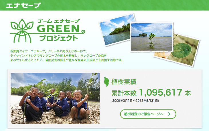 このエナセーブシリーズの売上の一部を、タイやインドネシアで、マングローブの森を甦らせて、CO2削減や災害防止など環境への取組みに役立てているそうです。その名も「チームエナセーブGREENプロジェクト」!!