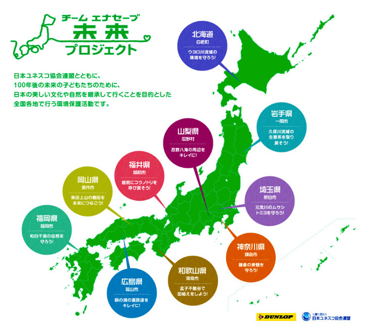 100年後の子どもたちのために、日本の文化や自然を守っていく環境保護活動、「チームエナセーブ未来プロジェクト」もスタート!!ダンロップが「自動車タイヤ国産第一号」を生産してから100年後にあたる2013年11月にエナセーブ100を発売。100年という節目の年に始まったプロジェクトなのだそうです。