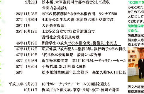 創業以来、関東大震災で最初の焼失、戦後のGHQによる接収など激動の昭和を生き抜いてきた松本楼。1971(昭和46)年11月19日、沖縄返還闘争の学生デモ隊の放火により、残念ながら二度目の焼失を経験してしまいました。