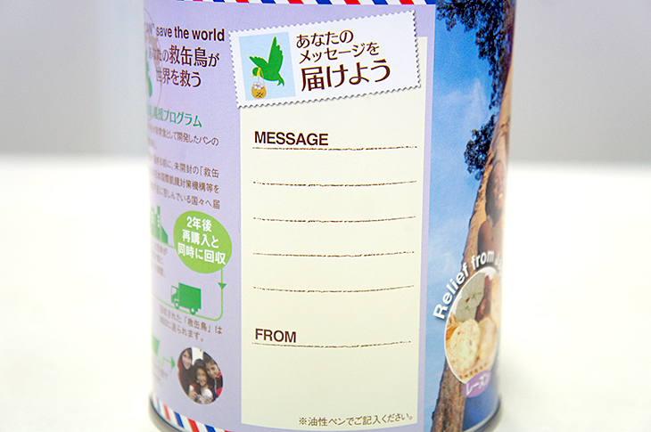 ですから缶の裏面には子どもたちへのメッセージを書き込める様にもなっています。