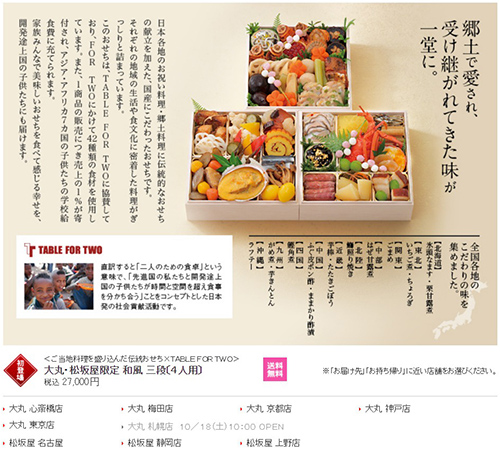 販売するのは大丸松坂屋百貨店さん。「ご当地料理を盛り込んだ伝統おせち×TABLE FOR TWO」というもので、