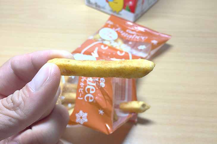 パッケージには「じゃがビー」のキャラクター「ポッタ」。雪遊びしているイラストがなんとも可愛いですね。箱から出して、袋を開けてみると、じゃがいもを揚げた香りがふわっと広がります。