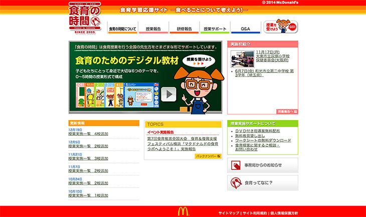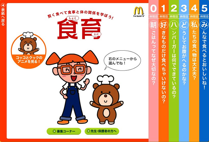 マクドナルドは、2005年に食育の一環としてアニメやゲームで楽しく食に触れられるWeb教材『食育の時間』というサイトをオープンしました。