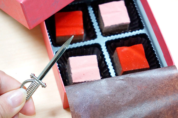 コメントその名も「ラブオセロ」赤とピンクのチョコがオセロ状に並んでいる大人の味。しかも中には獲物を狙ったような短剣型のピックがキラリと光っています。