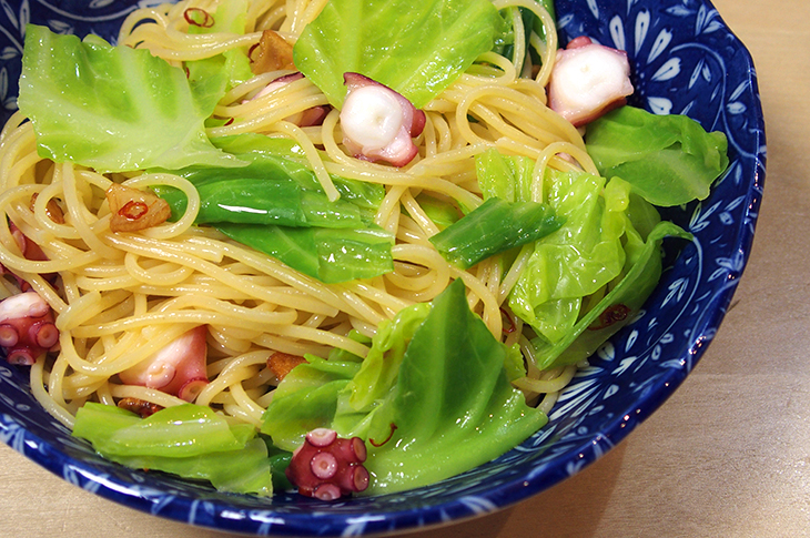 インカインチオイルをつかった、キャベツとタコのペペロンチーノ