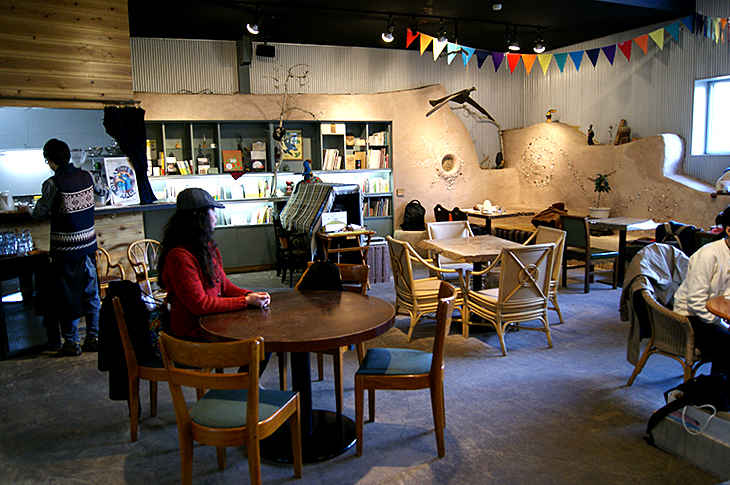 粘土細工のような手作り感あふれる内装は、ワークショップ形式でお客さんも参加して仕上げたもの。ストローベイル(麦藁)や珪藻土など、断熱性の高い自然素材が使われています。お洒落なだけじゃなく、エコ!店内には、小さなお子さんを連れたお母さんたちの姿も目立ちます。