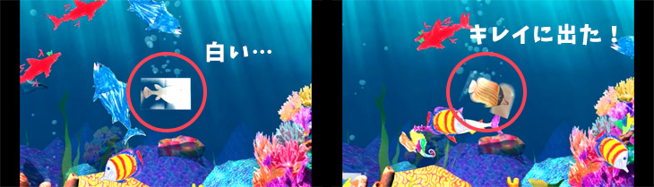 「紙」に自由に魚の絵を描くと描いた魚と共に、目の前の巨大な水族館でその魚たちが泳ぎ出します。