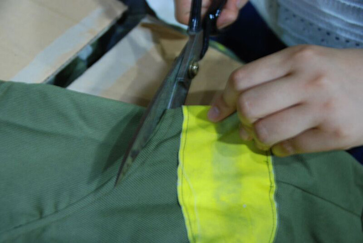 一着に一つしかとれないサインと呼ばれる蛍光の黄色いマークを生かしたデザインにするために、服の裁断から裁縫はすべて手作業で行われています。