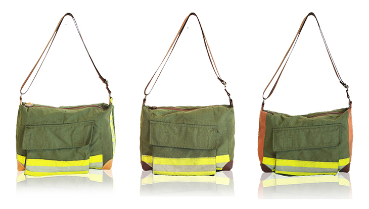 そんな定番のバックとして持ちたい蛍光の黄色とカーキの配色のこのバック。じつは名古屋市の消防局で使用されていた消防服をバックとしてリメイクして作られたものなのです。
