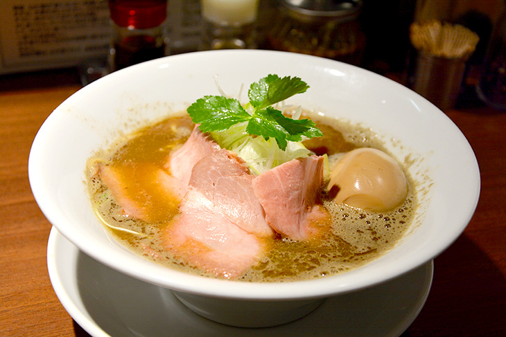 ほどなくして、お待ちかねの中華そばが登場。通常トッピングのチャーシュー、ネギ、三つ葉などと一緒に、程よく色づいた煮玉子が浮いています。