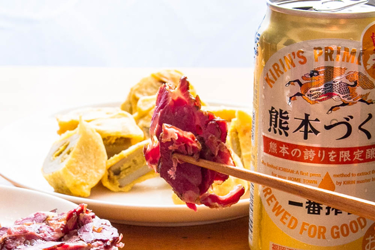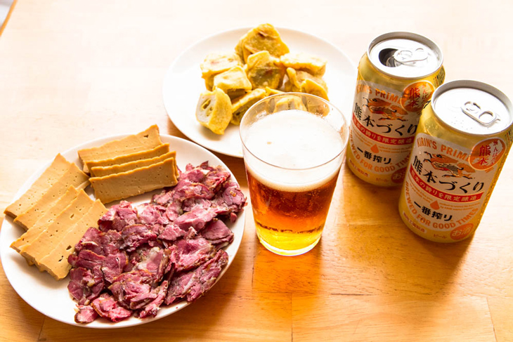 せっかく熊本の一番搾りを飲むのだからと、こちらで買える熊本のおつまみも用意して、いざ乾杯!