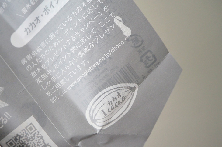ピープルツリーのフェアトレード・チョコレートのパッケージの裏面にあるカカオポイントを集めると、カカオ豆の苗木を贈ることができます。