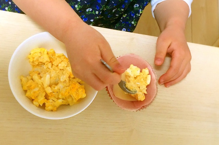 混ぜる、詰めるといったちょっとしたお手伝いでも、調理に参加して、自分でつくった料理を食べることは、子どもたちにとって大切な経験になりますよ。
