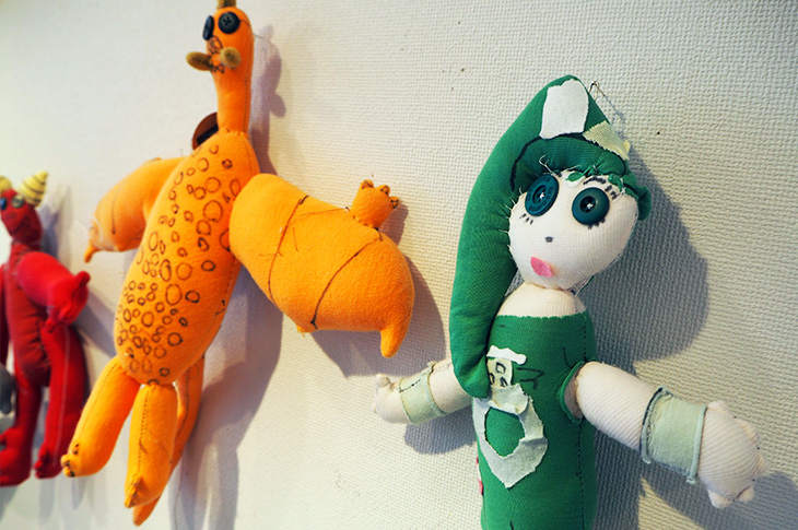 こだわりの強い秋場さん、制作に使用する生地は色々試した結果、Tシャツ用の綿のニット地がベストということに落ち着き、目はぬいぐるみ用ではなく洋服用のボタンに決まっているのだそう