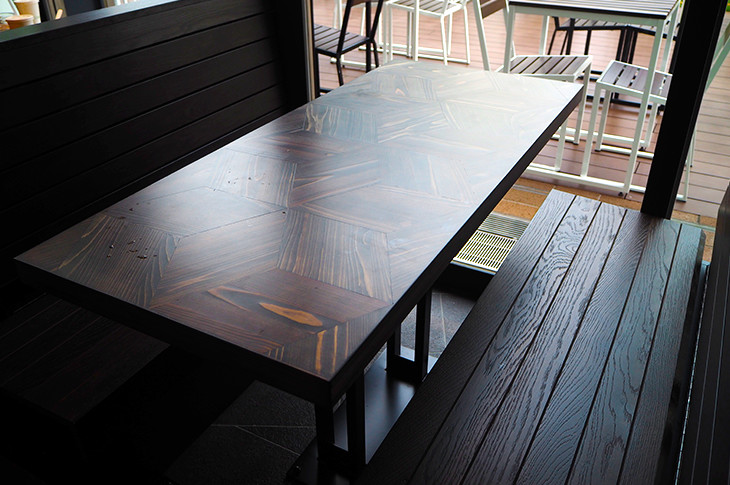 例えば、天井やテーブルには国産杉とヒノキの間伐材・古材を再利用していたり