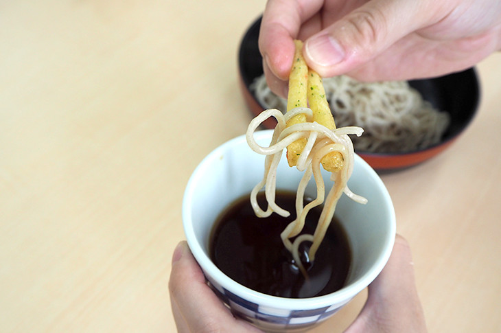 長さも足りないのでつゆの底に落としたそばには届きません。