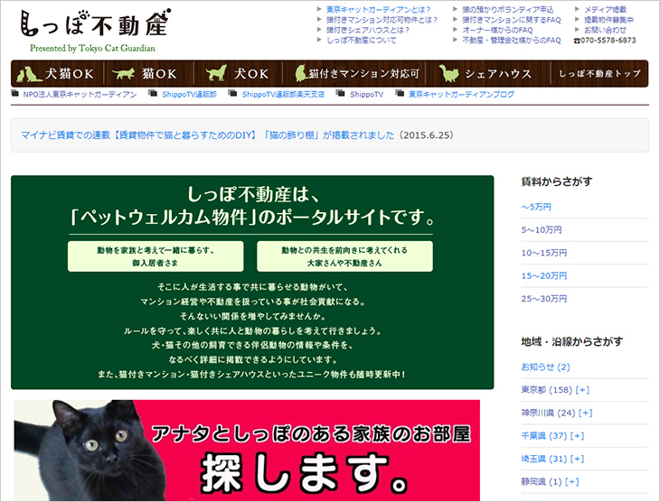 そんな「猫付きマンション」物件をたくさん紹介しているのが、「東京キャットガーディアン」が運営しているWebサイト「しっぽ不動産」。