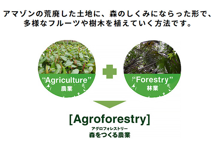 アマゾンでは森林を伐採して農地開拓し、土地が生産性を失うと別の土地を切り開く・・・といった農業が行われ、次々に森林が減少しています。 これに対しアグロフォレストリーは、同じ土地で永続的に農業を営むことができるため、アグロフォレストリーの輪が広がるとその様な負のサイクルが食い止められます。