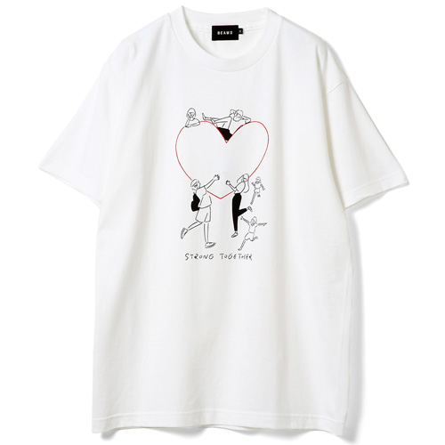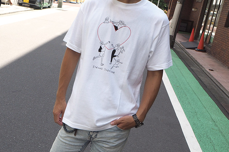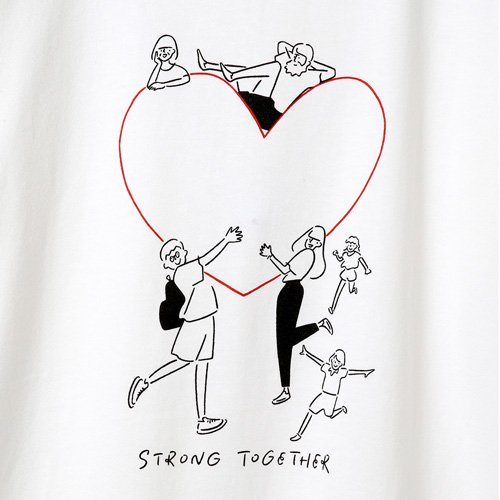 Tシャツにプリントされるデザインは、国内外から注目を集めているイラストレーター・長場雄さんの描き下ろしによる、大きなハートを老若男女が共に支え合うイラストです。どんな時も、力を合わせれば、強くなることを「STRONG TOGETHER」の言葉で表しています。