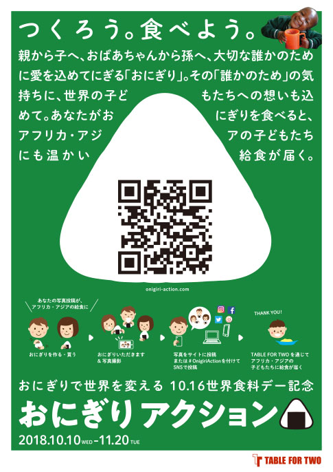 「おにぎりアクション」は特定非営利活動法人TABLE FOR TWO International(以下、TFT)により2015年から毎年開催されています。2017年までに累計で27万枚の写真が集まり200万食の給食を届けた、日本有数の大規模なソーシャルアクションなんです。