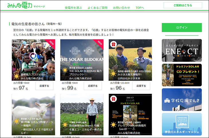 みんな電力では、電気の生産者を知ることができるサイトを運営しています。このサイト上で翌月分の「応援」する発電所を1ヶ所選択すると、電気代の一部を応援金として発電所に支払うことができるのです。つまり、自分のお気に入りの生産者を「応援」できる仕組みになっています。これが「顔の見える電力」です。