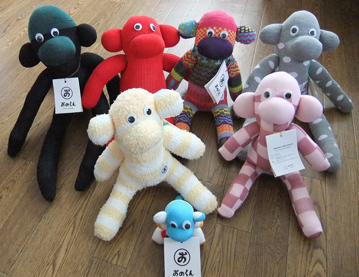 「おのくん」は靴下で作られたソックスモンキーと呼ばれるぬいぐるみで、東日本大震災で大きな被害を受けた宮城県東松島市の旧小野駅前応急仮設住宅に住んでいたお母さんたちによってつくられました。「おのくん」というネーミングもそこから付けられています。