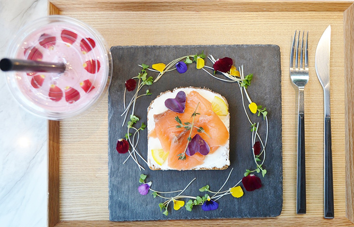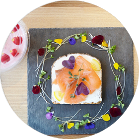 味はさっぱりしたクリームチーズと、濃いめのサーモンで相性ピッタリの組み合わせ。プレートのまわりに散りばめられた花は、すべて食用。食感のアクセントがオープンサンドをさらに引き立てます。