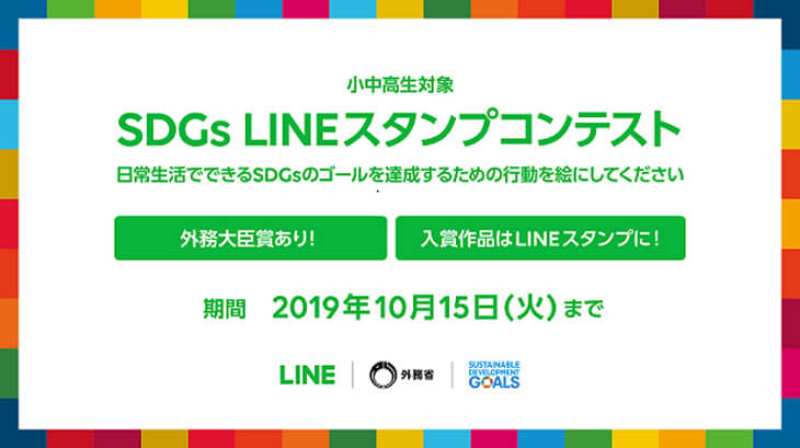 今般,外務省は,LINE株式会社と協力し,小中高校生を対象にした「SDGs LINEスタンプコンテスト」を開催します(応募期間:2019年9月4日から2019年10月15日まで)。https://t.co/hkuTlfn3J3 pic.twitter.com/V7LI6dPFZm