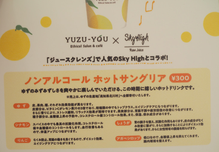 2階のカフェスペースではゆずを使ったオリジナルドリンクが1杯300円で楽しめます。