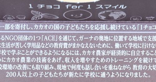 ふたの裏側にはフェアトレードの説明がしっかり。ガーナのアシャンティ州の村でカカオ農家を支援して、多くの子どもたちが学校に通えるようになったんですって。