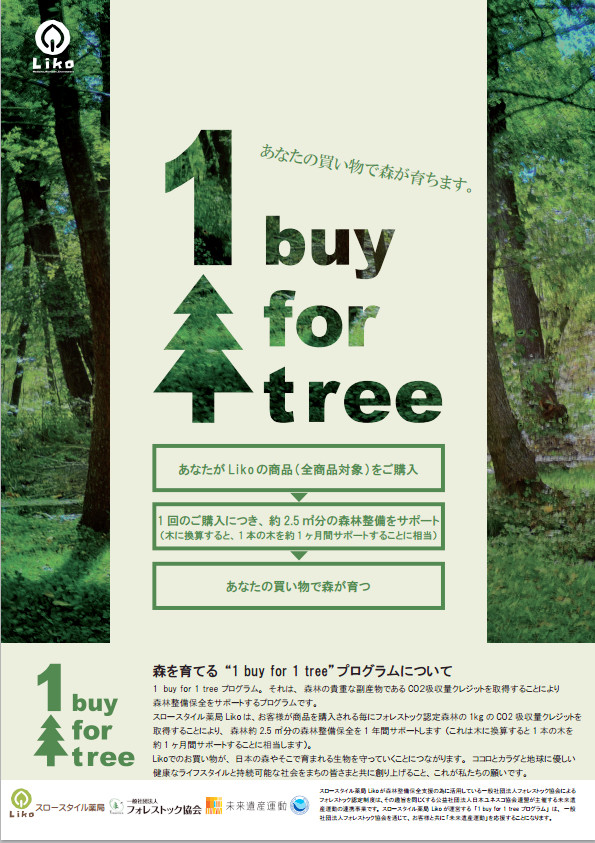 この「スロースタイル薬局Liko」が行っているのが、「1 buy for1 tree」というプログラム。
