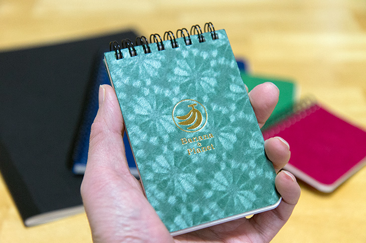 ノートの表紙にはバナナペーパー製を示すマークが捺されています。紙自体は、和紙の製法を取り入れているからか、繊維のかけらが見えたり多少ざらついていたりしますが、それがむしろほどよい風合いになっています。