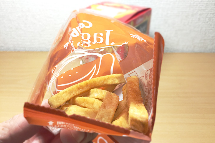 パッケージには「じゃがビー」のキャラクター「ポッタ」。雪遊びしているイラストがなんとも可愛いですね。箱から出して、袋を開けてみると、じゃがいもを揚げた香りがふわっと広がります。