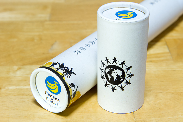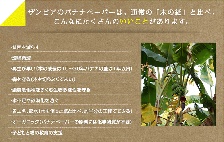 このバナナペーパーはアフリカ南部の国・ザンビアの村で生まれています。世界が目指す持続可能な発展とフェアトレードの基準に沿っていて、商品名はOne Planet Paper® です。今まで廃棄されていたバナナの茎から繊維を取り出す仕事で、貧困にあえいでいたザンビアの村に雇用が生まれました。そして、児童労働の禁止、子どもの就学を推進しています。販売する商品(紙)の売上の一部をザンビアの村に還元し、教育を受けたことのない大人向けの教室も開いています。