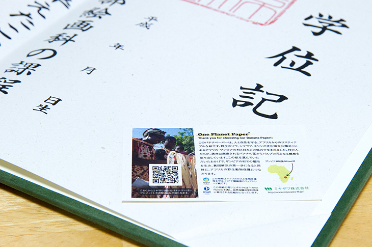 まずは、主役の卒業証書です。バナナの茎の繊維が感じられる、少しざらざらした触り心地です。普通の卒業証書だとつるつるのものが多いのですが、これは触った瞬間に普通とは違うことを感じられます。