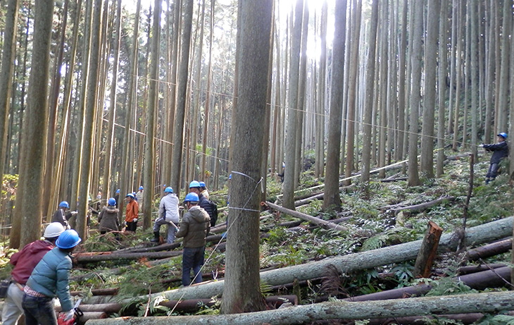 木村:日本の森は、戦後の政策によってスギやヒノキ等の針葉樹が植えられた人工林が多くあるのですが、自然に生えている天然林と違って材として加工することを前提にまっすぐな木を育てるため、本数を多く、密に植えられています。そのため定期的に木を間引(間伐)してあげないと良い木が育たず、また光が樹の根元まで届かないことで、草や他の植物も生えなくなり保水力が落ちて雨が降ると土砂崩れの原因となったりして大変危険なんです。また、間伐した材も含めて使うことが大切なのですが、私たちのライフスタイルの変化や海外から安価な材が手に入るようになったことで日本の木を使う機会が減り、人の手が入らない森が増えているという問題があります。
