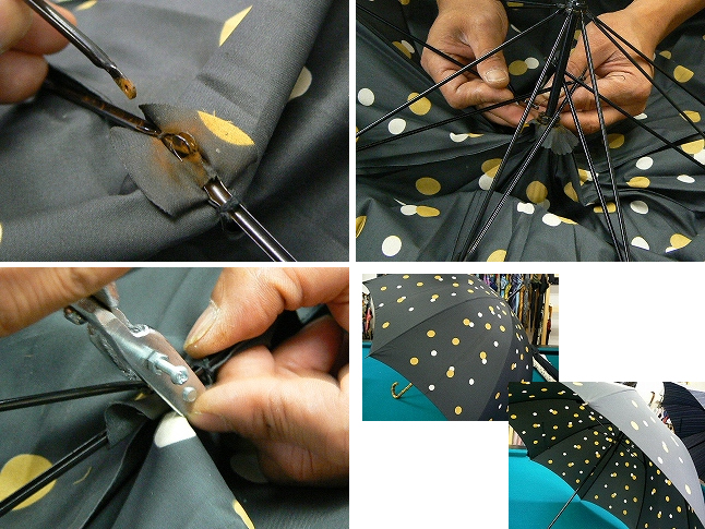 ウィットさんでは、骨の折れている傘や傘としての機能を果たさないものをリフォームし、再び使えるように工夫されています。たとえば、親骨が大きく曲がってしまった傘も、一度、専用工具で分解し、別の親骨に換えていきます。