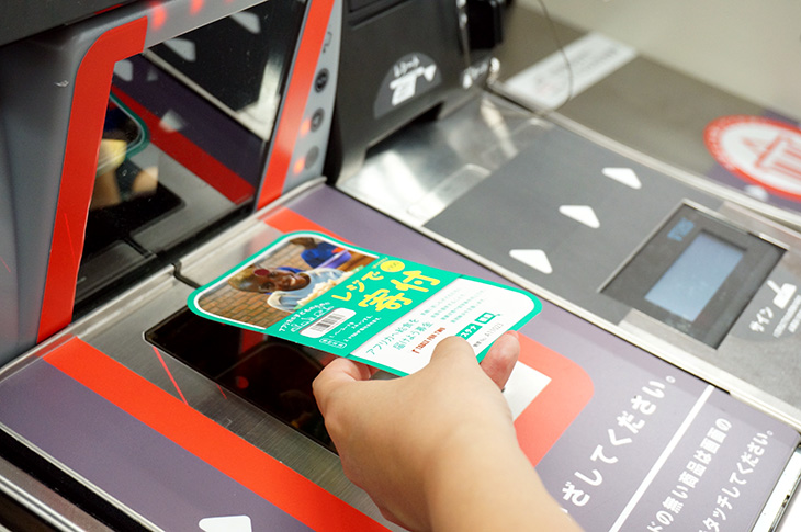 手順:(1)カードのバーコードをスキャン (2)スキャン回数により100円単位の寄付ができる
