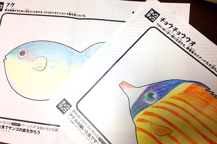 この水族館は、みんなが描いた魚たちが泳ぐ水族館です。