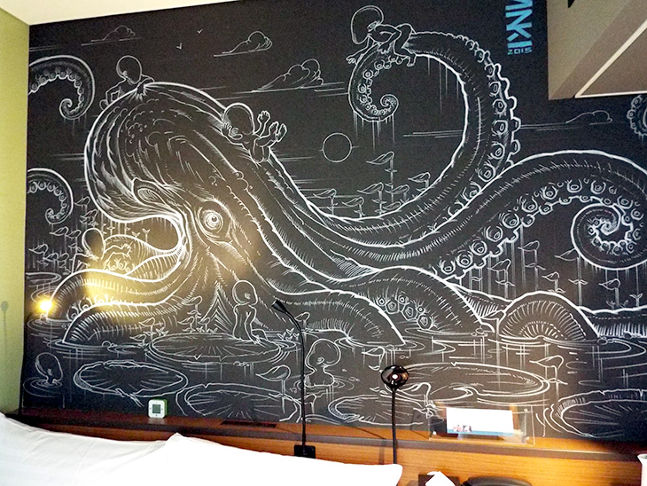 三部屋目は、Dan Kitchener(ダン・キッチェナー)による「The Lily Garden」です。「おお・・・」と感嘆とも驚きとも、若干戸惑うくらいの迫力です。彼はビールのHeinekenやコンバース、キリン一番搾りなどとコラボしたこともあるようです。けっこうパンチのあるユニークな絵だけれど、この作品のどこが“Lily”なのだろう・・・。スタッフさんによる「たこ焼きからイメージを膨らませたのでは」という説など、謎がいっぱいです。癒しなのか、挑戦なのか、とにかく心が揺さぶられます。ホテルの部屋にこんな作品を描いてしまうチャレンジ精神に脱帽です。