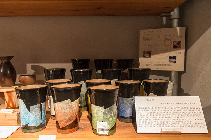 和紙を織り込んだようなデザインが印象的なビアカップは、九谷焼の一品。ひとつ3500円と、普段使いするにも気後れしない値段でうれしいです。美しさもさることながら、ビールの泡をいかにきめ細かいものにするかを追求した末に完成したとのこと。キンキンに冷やしたビールをこれに注いで飲むと実に美味しく飲めそうです。