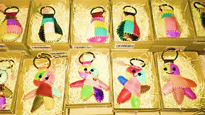 よ~く見ると一つひとつ違う形をしている雑貨が多いのは、すべて手作りだから。服にお花のような飾りがついているものもあります。