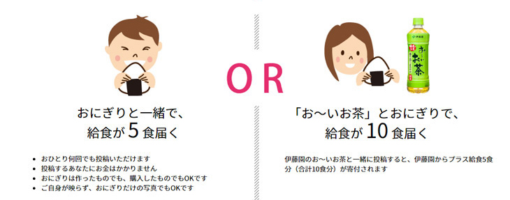 さらに嬉しいのがこれ!おにぎりと一緒に、伊藤園の「おーいお茶」を写真に収めて投稿すると、伊藤園さんからプラス給食5食分(計10食分)が寄付されるんですって。おにぎりを食べる時にはお茶が必須アイテムな私には朗報です。いつもどのお茶にしようか悩むのですが、しばらくは悩まずにすみそうです。