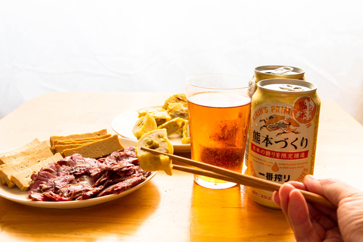 せっかく熊本の一番搾りを飲むのだからと、こちらで買える熊本のおつまみも用意して、いざ乾杯!