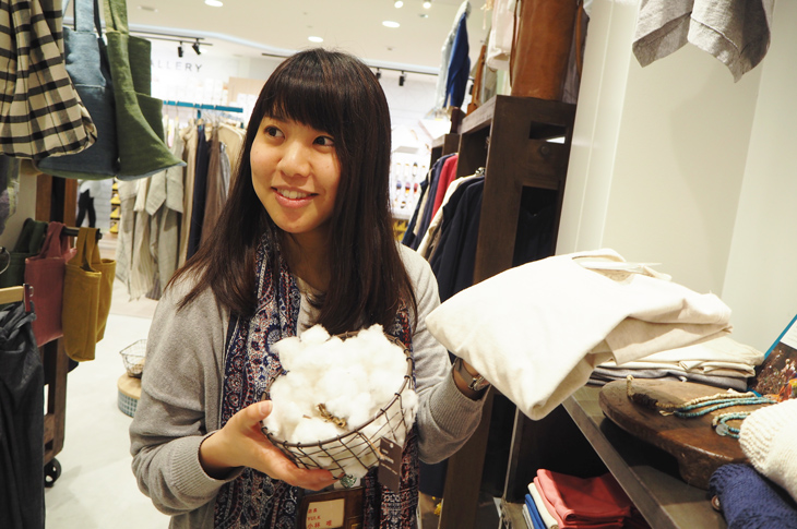 店員さん「農薬がついてないので、コットンがふんわりしているんですよ。長く使っていただきたいので、襟には洗濯しても伸びにくい工夫をしています!」
