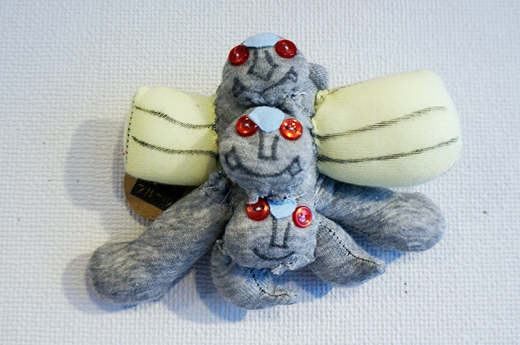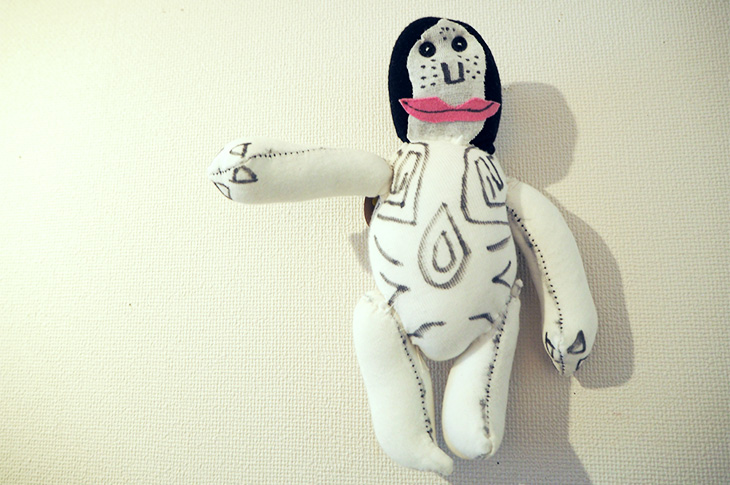 こだわりの強い秋場さん、制作に使用する生地は色々試した結果、Tシャツ用の綿のニット地がベストということに落ち着き、目はぬいぐるみ用ではなく洋服用のボタンに決まっているのだそう