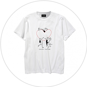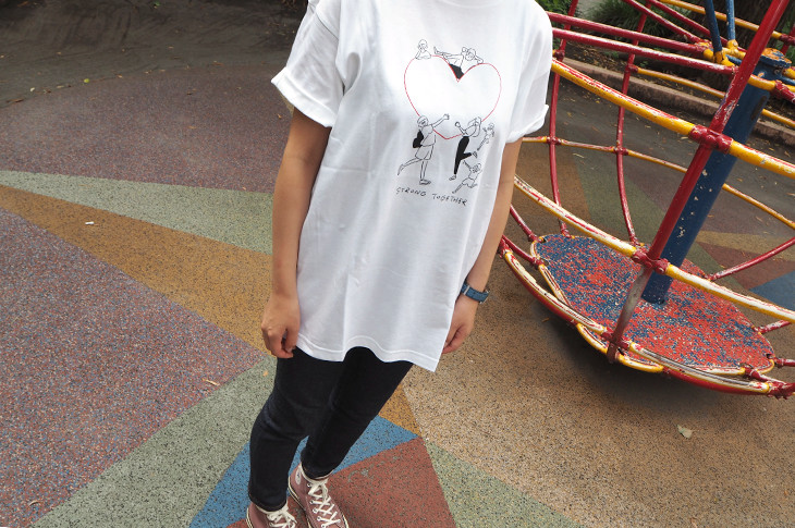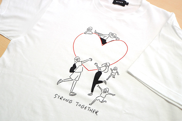 Tシャツにプリントされるデザインは、国内外から注目を集めているイラストレーター・長場雄さんの描き下ろしによる、大きなハートを老若男女が共に支え合うイラストです。どんな時も、力を合わせれば、強くなることを「STRONG TOGETHER」の言葉で表しています。