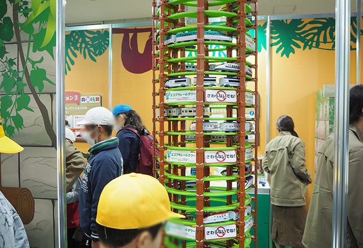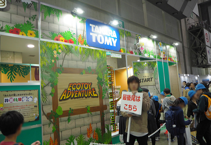 タカラトミーは環境配慮のタカラトミー基準を設定し、それをクリアしたおもちゃを「エコトイ」として認定しています。ブースではエコの工夫がいっぱいのおもちゃを紹介していて、参加してクリアすると「エコトイカードゲーム」がもらえるので大人気!さすが、子どもたちのハートを鷲掴みにするツボを心得ています。