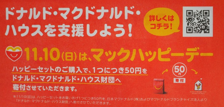当日は日本全国のマクドナルドでハッピーセット購入1つにつき50円が「ドナルド・マクドナルド・ハウス」へ寄付されます。昨年はなんとハッピーセットの売上から32,153,850円も寄付できたのだとか…!